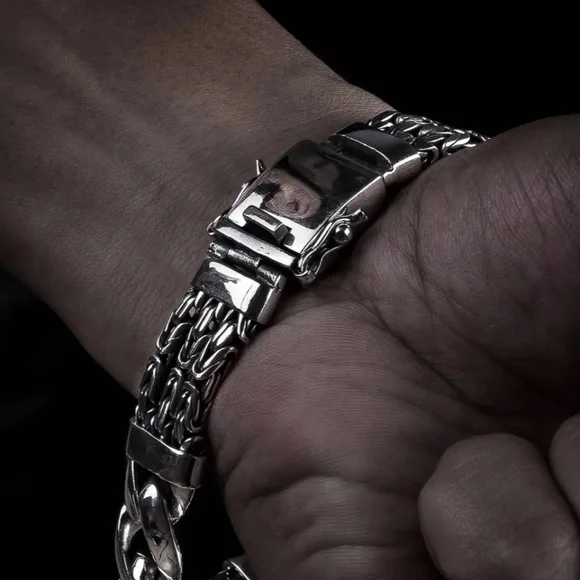 Mens Silver Bracelet - Misa & Co. Handcrafted in Bali Bracelet - Triple Strand Version - Solid 925 Sterling SilverMens Chunky Silver Bracelet Misa & Co. Artisan Collection - Handcrafted by Artisans in Bali Bracelet - Triple Strand Version - Solid 925 Sterling SilverLength: 22cm when clasp is locked ( For Larger wrists )Triple Strand Bali/Cuban Bracelet - Features connecting Cuban links.Made of Solid 925 Sterling Silver finished in remarkable quality and heavy weight.Weight Varies from piece to pieceTriple Bali strands are around 4mm eachThis design is really comfortable to wear and has a unique look. The hinged clasp double Box lock is of outstanding quality and very strong - never need to worry about falling off.
